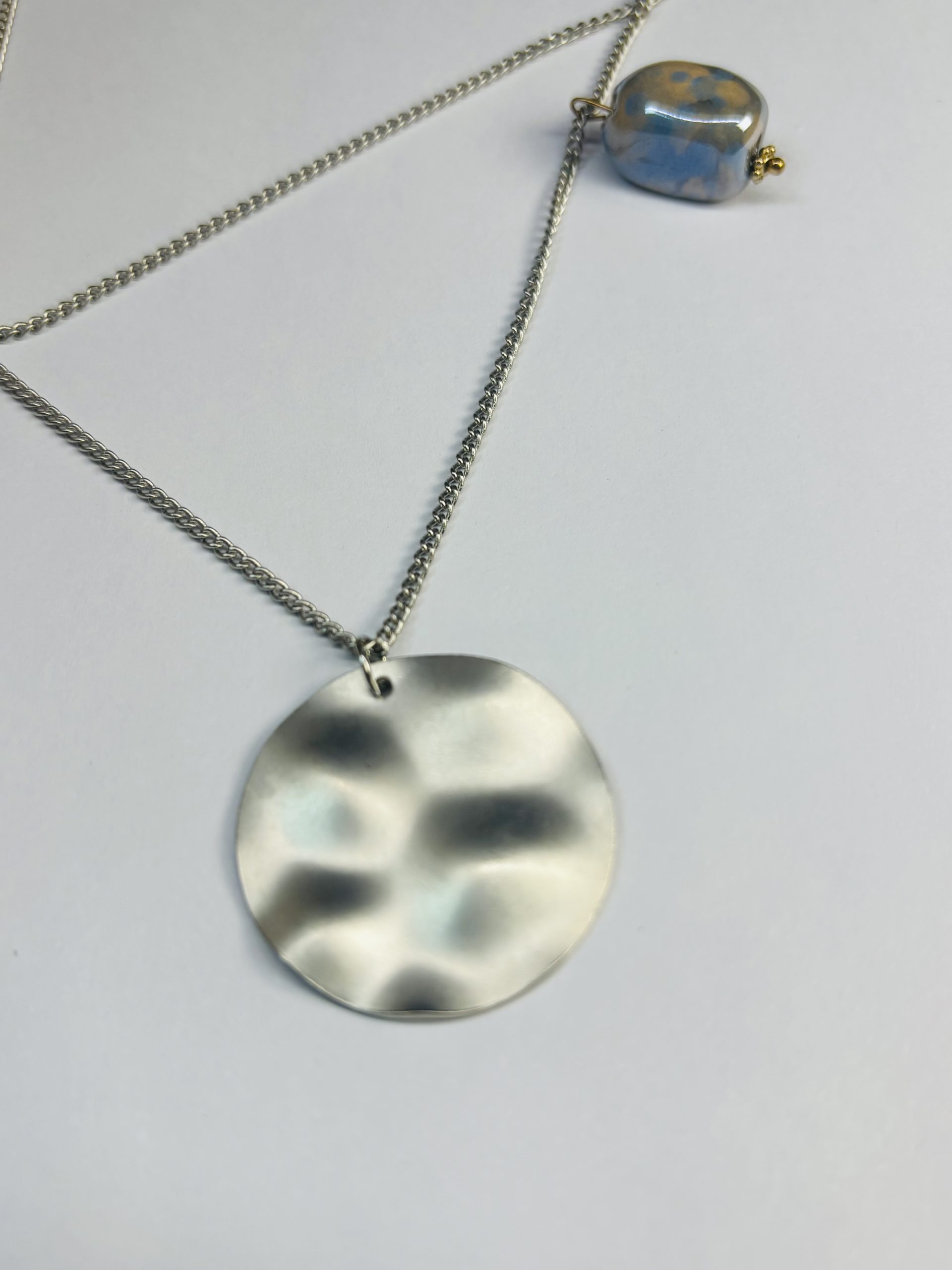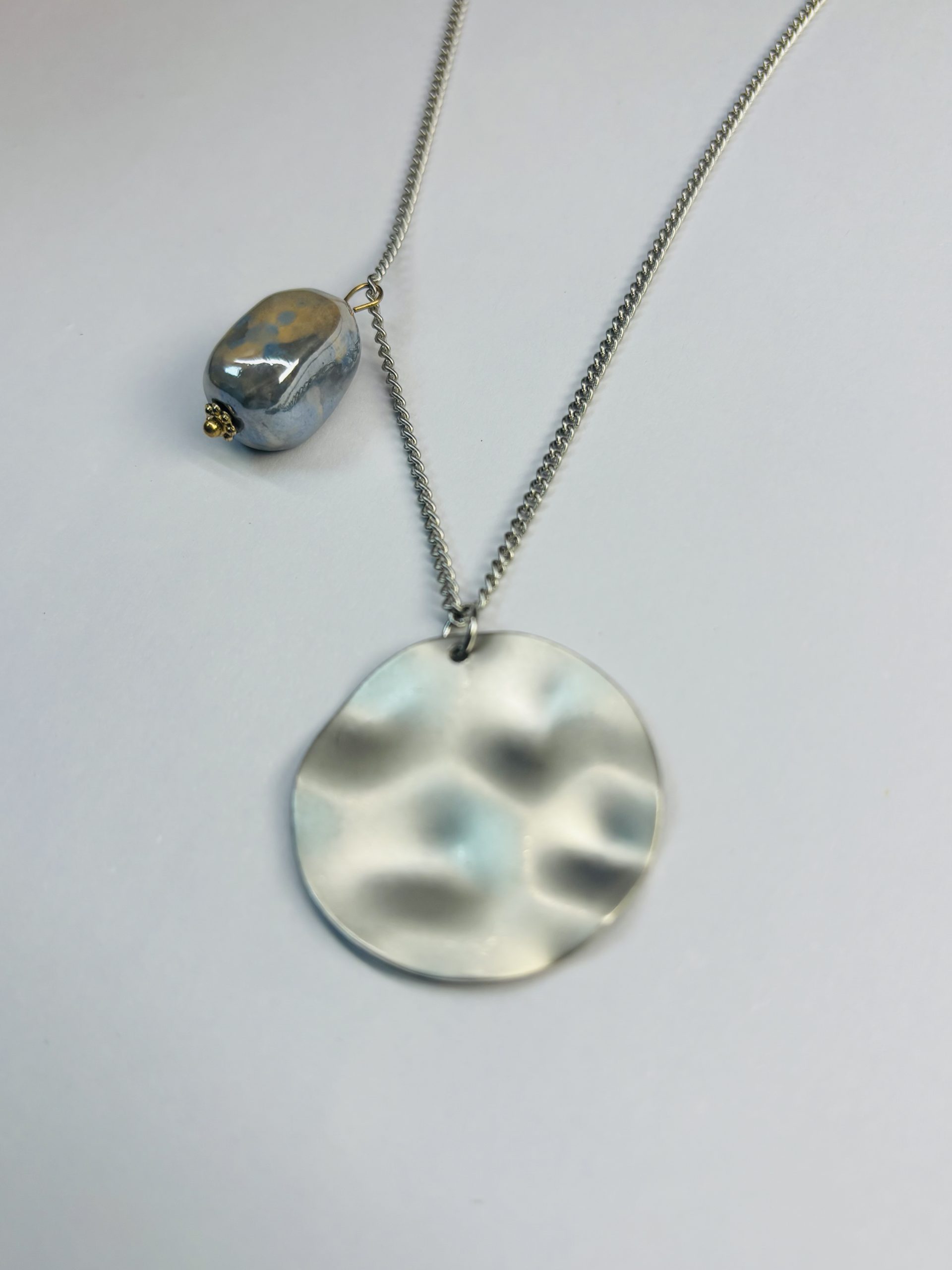 | Silver-Toned Hammered Disc and Baroque Pearl Pendant Necklace
